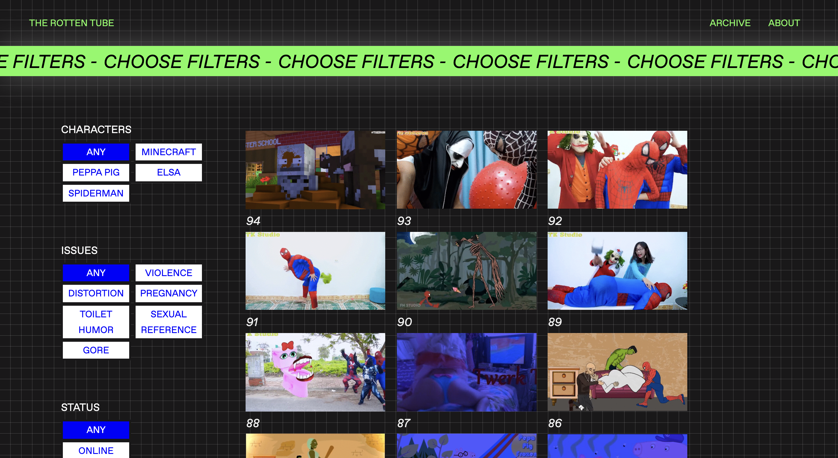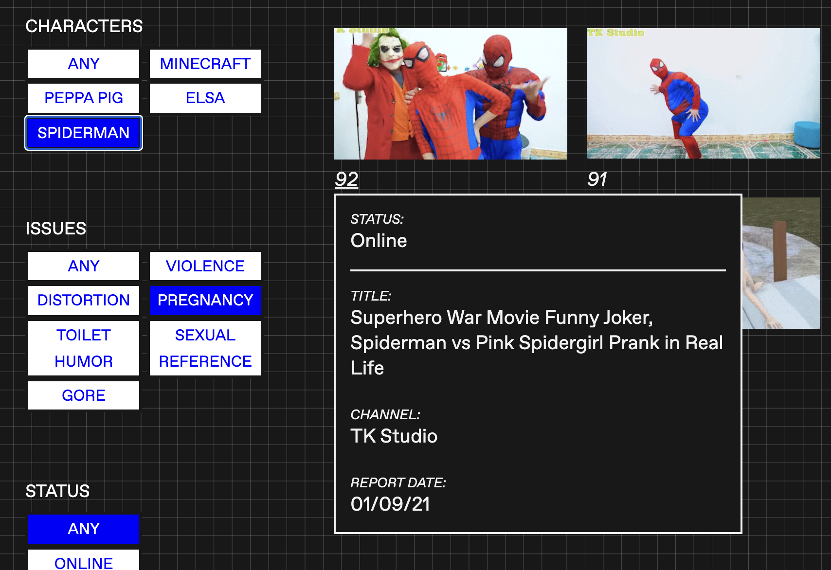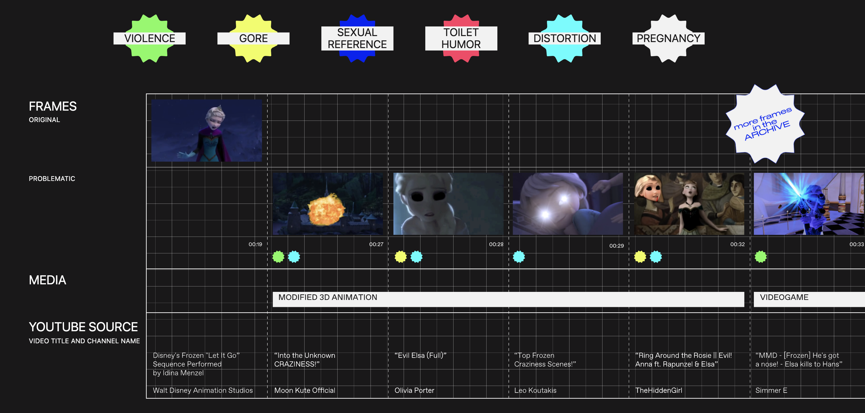 A web series of four experimental videos about inappropriate contents on Youtube adressed to kids (Elsagate phenomenon). Each one is composed of selected frames taken from different videos, actually collected from Youtube.